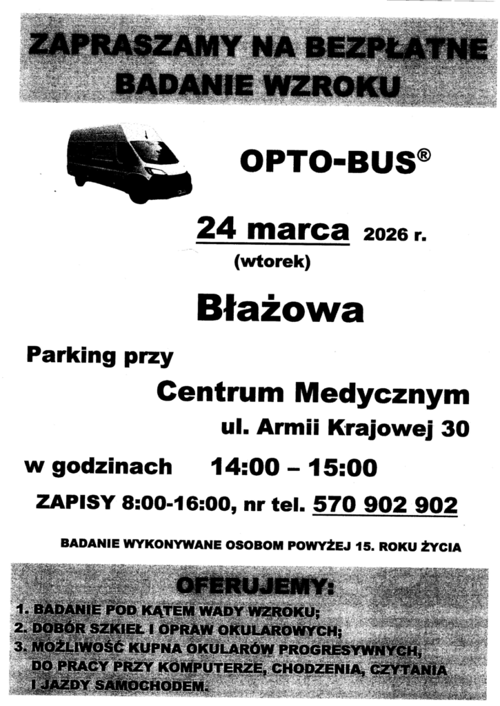 - We wtorek 24 marca 2026 r. w Błażowej na parkingu przy Centrum Medycznym (ul. Armii Krajowej 30) bezpłatne badanie wzroku w godz. 1400-1500. Badanie dla osób powyżej 15 roku życia. Konieczne wcześniejsze zapisy w godz. 800-1600 tel. 570-902-902.