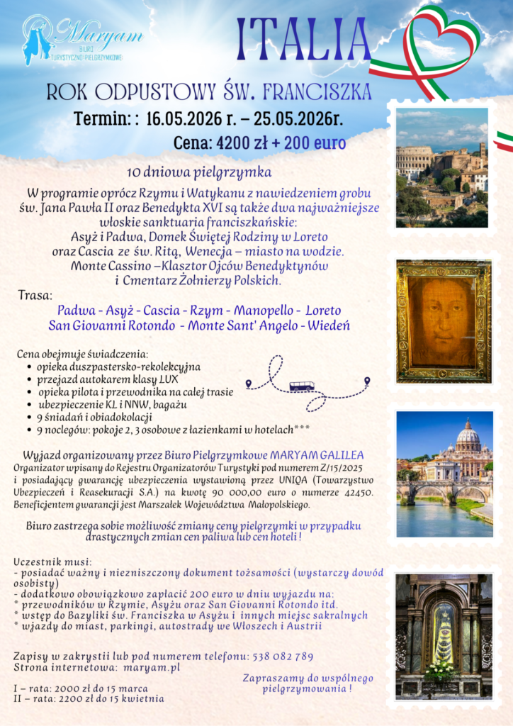 - Parafia Błażowa organizuje 10-dniową pielgrzymkę z racji Roku Odpustowego św. Franciszka do Włoch w dniach 16-25.05.2026r. koszt to 4200 zł i 200 euro. Zapisy w zakrystii w Błażowej lub pod nr tel. 538 082 789 do 15 marca. Więcej informacji na stronie parafii i na plakatach w gablotach.